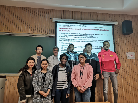 本场授课Pantoleon Skayannis教授的讲授内容分为两个部分:第一部分是福特主义危机与新自由主义和紧缩政策的兴起;第二部分则讲述了希腊的大型交通基础设施项目。授课过程中,同学们对Pantoleon Skayannis教授的研究表现出了极大兴趣,整个课堂气氛热烈,同学们表示受益匪浅。