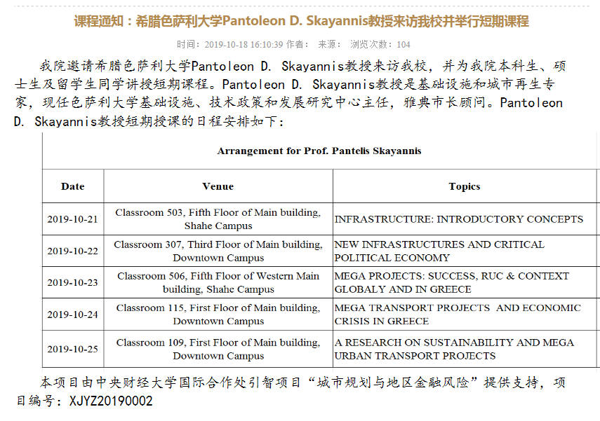 Pantoleon Skayannis教授是基础设施和城市再生专家,现任色萨利大学基础设施、技术政策和发展研究中心主任,同时担任雅典市长顾问。本次Pantoleon Skayannis教授的短期授课日程共分五天分别在我校学院南路校区及沙河校区举行。