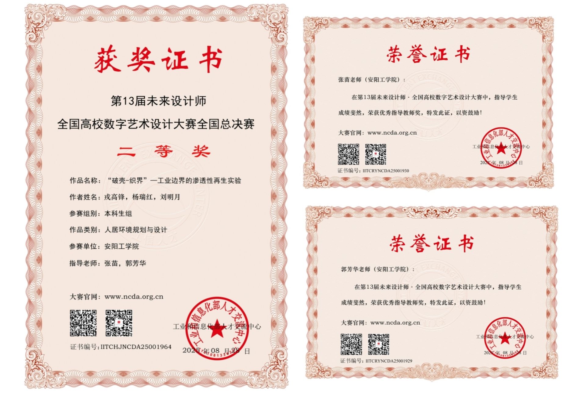 在2025第13届未来设计师·全国高校数字艺术设计大赛(NCDA)竞赛中,beat365官网师生荣获人居环境规划与设计类全国总决赛二等奖一项、河南赛区奖项六项;张苗、郭芳华、于盼盼、杨媛媛、王昭娜、刘赚六位教师荣获“优秀指导教师”奖。